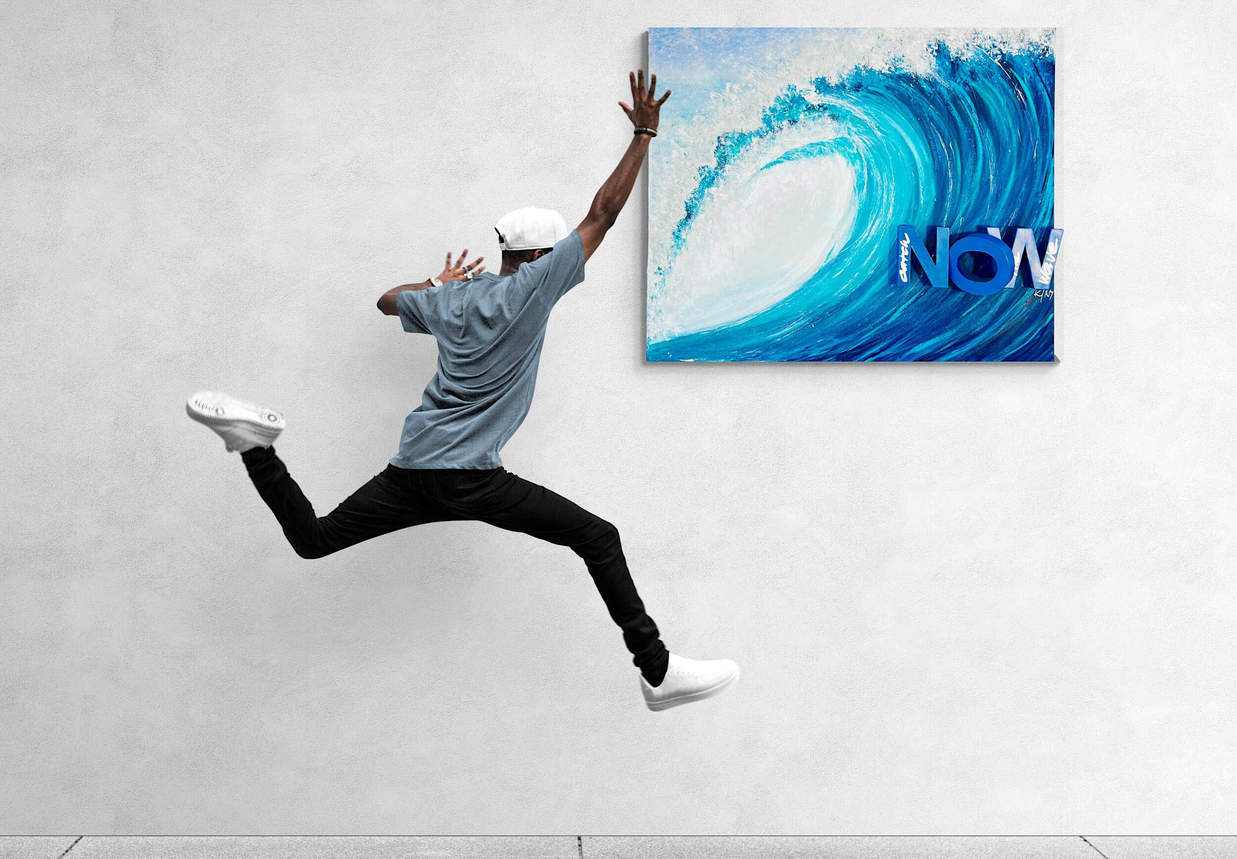 At its base, three sculptural letters spell NOW, framed by the call to action: catch the wave.
