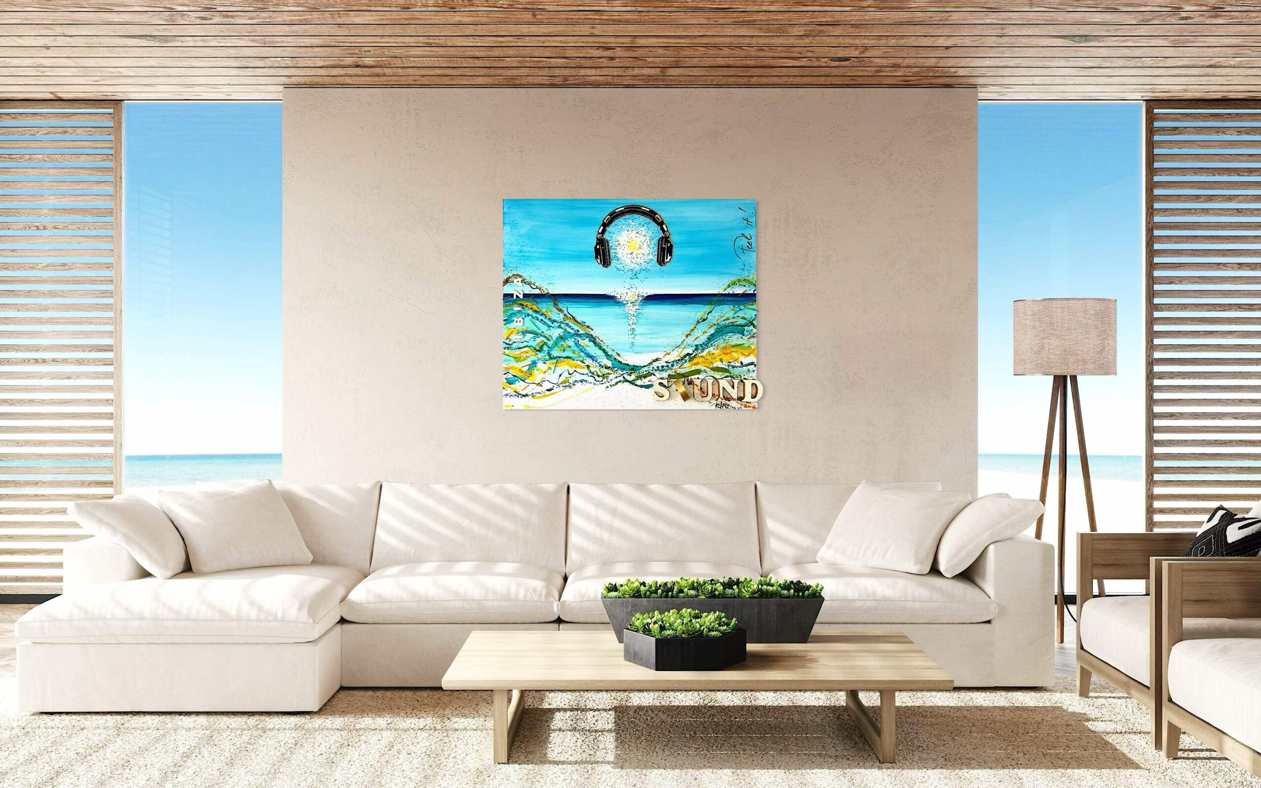 Above it, a sculpted soundwave in blue, turquoise, orange, and yellow flows across the surface — not breaking, but vibrating.